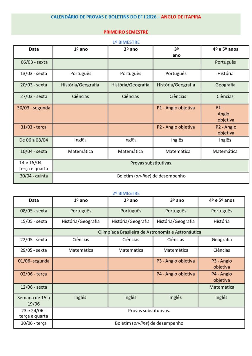 Calendários de Eventos - Fundamental I/ 2 e Médio