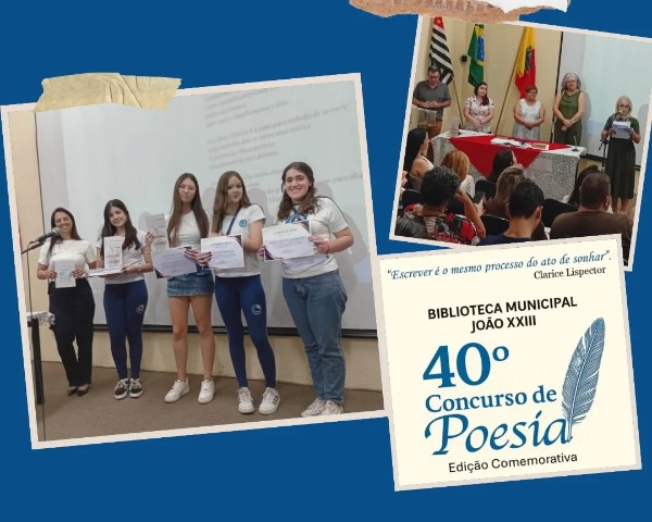 O 40º Concurso de Poesia de Mogi Guaçu, organizado pela Secretaria Municipal de Cultura, premiou alunos da rede pública e privada das escolas de Mogi Guaçu e região. Dentre os alunos premiados, Pietra Rogato Ramponi, Ana Laura Barbosa, Lívia Sukada e Ana Júlia Mariano - que ficou em 1° lugar - representaram os Colégios Anglo Itapira Mogi na Categoria Juvenil local e Juvenil outras cidades. Agradecemos à professora, Meire Barreiro, literatura e redação, pelo empenho e estímulo à participação. Meire também foi premiada na Categoria Adulto.